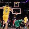 Celtics fall to Lakers in fourth straight loss IT'S OVER: Lakers rookie Kyle Kuzma celebrates as Marcus Smart hangs his head after missing a shot at the buzzer last night in Los Angeles.
