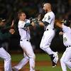 Lucroy's hit in 11th inning sends A's past Giants 4-3 On a day when they made a trade to strengthen the back of their bullpen, the Oakland Athletics overcame their All-Star closer's fourth blown save and kept their late-inning magic going.