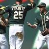 Athletics beat Astros 7-1 to move into tie for AL West lead OAKLAND, Calif. (AP) - Trevor Cahill pitched one-hit ball for seven shutout innings and the Oakland Athletics, far behind in the AL West standings earlier this summer, tied Houston for the division lead by beating the Astros 7-1 Saturday.