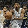 On Basketball: Butler made his move — now it's Wolves' turn FILE - In this April 11, 2018, file photo, Minnesota Timberwolves' Jimmy Butler drives to the basket ahead of Denver Nuggets' Paul Millsap, right, during the first half of an NBA basketball game in Minneapolis.