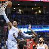 Thunder win fifth straight, lose Westbrook to sprained ankle After coming down hard on the side of his foot, Westbrook pounded the ground in frustration before limping off the court. The Thunder led 84-77 when he left the game with 4:25 left in the third quarter.