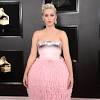 Katy Perry Turns Heads at the 2019 Grammys in a Dramatic Pink Gown Katy Perry hit the 2019 Grammys red carpet and per usual, the 34-year-old singer wore a standout look. She chose a strapless bubblegum pink Balmain Couture gown featuring a sculptural silver-accented bodice and a structured pleated skirt.
