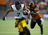 Hamilton Tiger-Cats' Shamawd Chambers (7) is tackled by B.C. Lions' Anthony Gaitor, back, and Solomon Elimimian, right, during the first half of a CFL football game in Vancouver, B.C., on Friday September 22, 2017. (Darryl Dyck/Canadian Press).