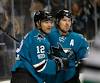 San Jose Sharks' Patrick Marleau (12) celebrate 1-0 goal with San Jose Sharks' Logan Couture (39) against the Dallas Stars in the first period of their NHL game at SAP Center in San Jose, Calif., on Sunday, March 12, 2017. (Josie Lepe/Bay Area News ...