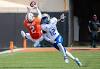 Sep 19, 2020; Stillwater, Oklahoma, USA; Oklahoma State Cowboys wide receiver Tylan Wallace (2) makes a catch over Tulsa Golden Hurricane cornerback Allie Green IV (12) during the second half at Boone Pickens Stadium. Mandatory Credit: Rob ...