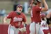 No. 3 Tide hand Razorbacks first SEC loss Alabama first baseman Kaylee Tow (12) celebrates Friday, April 9, 2021, after starting pitcher Montana Fouts recorded the final out of the sixth inning, stranding three Arkansas runners, during the Razorbacks' 5-3 loss to Alabama at Bogle Park in Fayetteville.